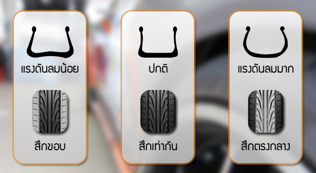 - ตรวจลมยางด้วยเกจ์วัดอย่างน้อยเดือนละครั้งตรวจเช็คประจำวัน ดูลักษณะดอกยาง กดลงบนพื้น