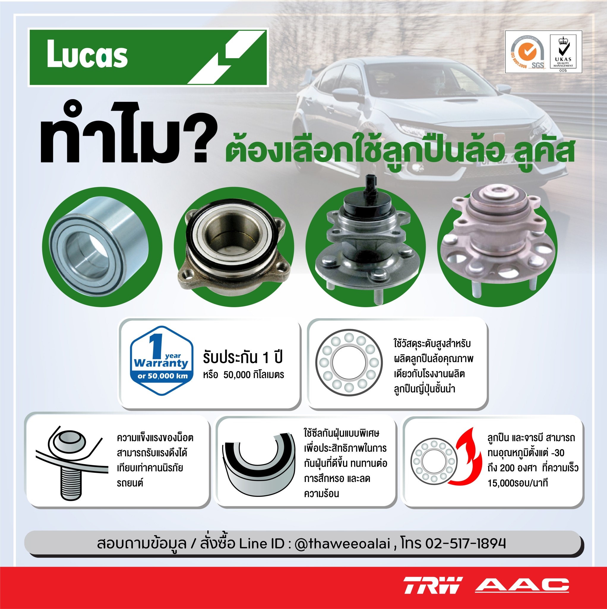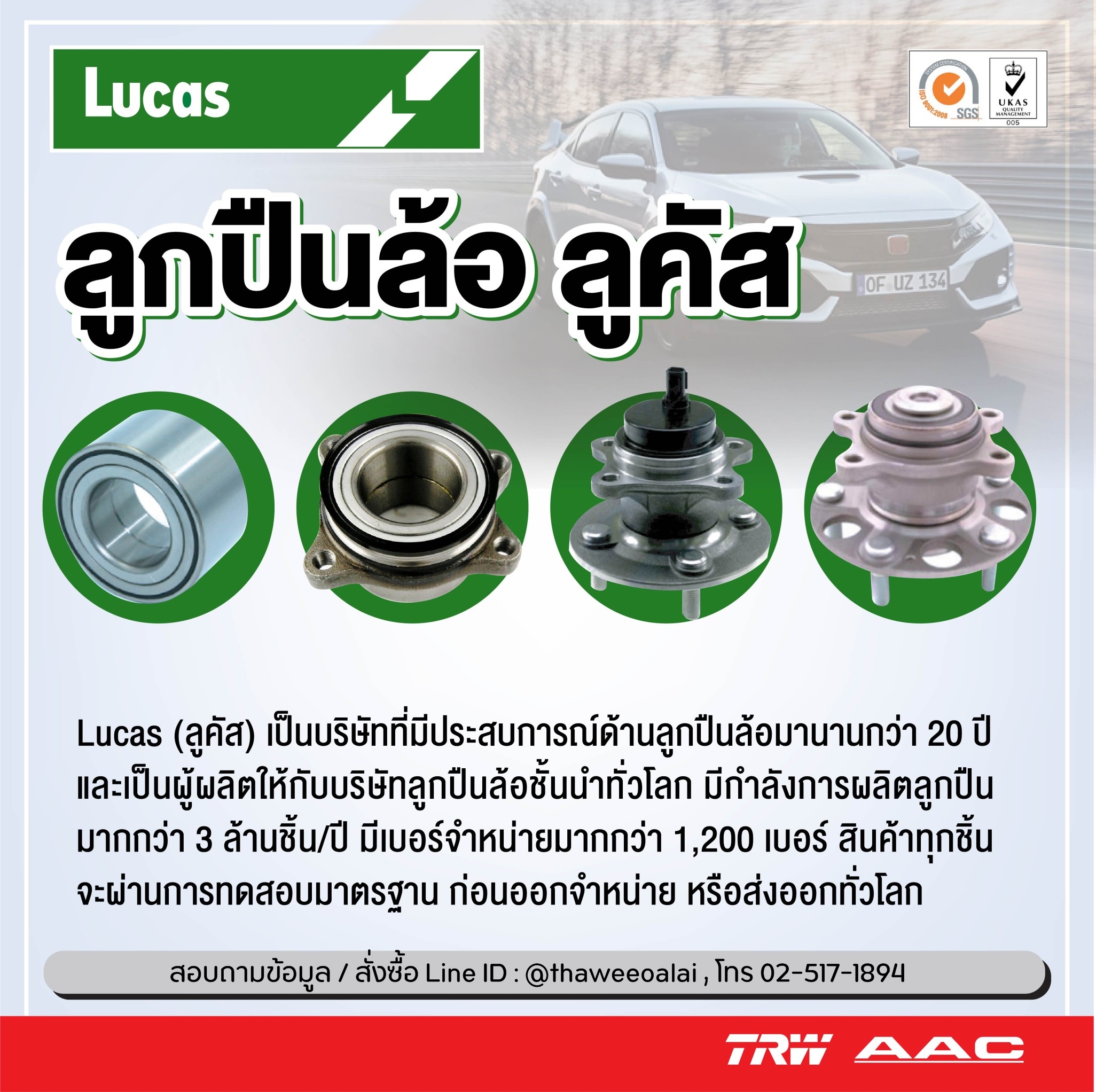 มาพร้อมด้วย 5จุดเด่นที่เหนือกว่า คุณจึงมั่นใจ ได้ในคุณภาพของลูกปืนล้อ LUCAS (ลูคัส) มีประสบการณ์ด้านลูกปืนล้อมายาวนานกว่า 20 ปี และยังเป็นผู้ผลิตให้กับบริษัท